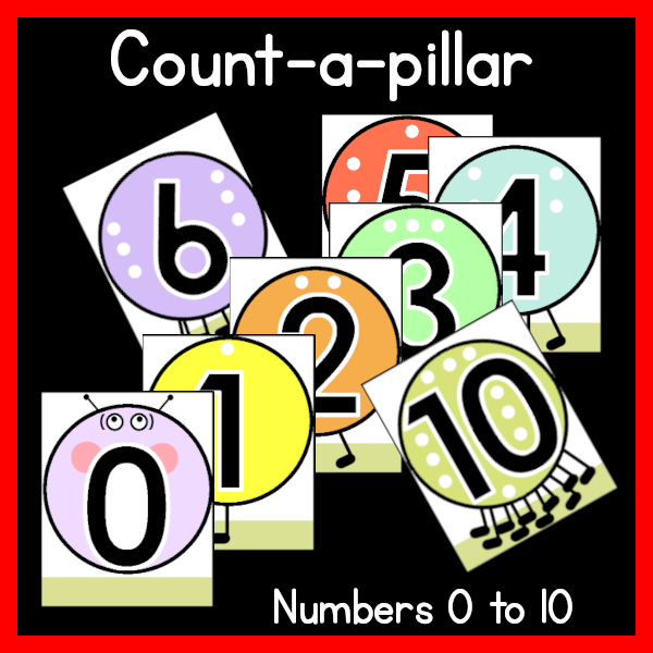 Learn about the numbers 1-10 and 0. Put the caterpillar together in counting order. Count forward and backward. The folder has instructions for different games you can play with the cards.