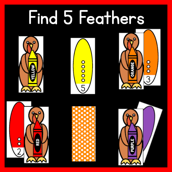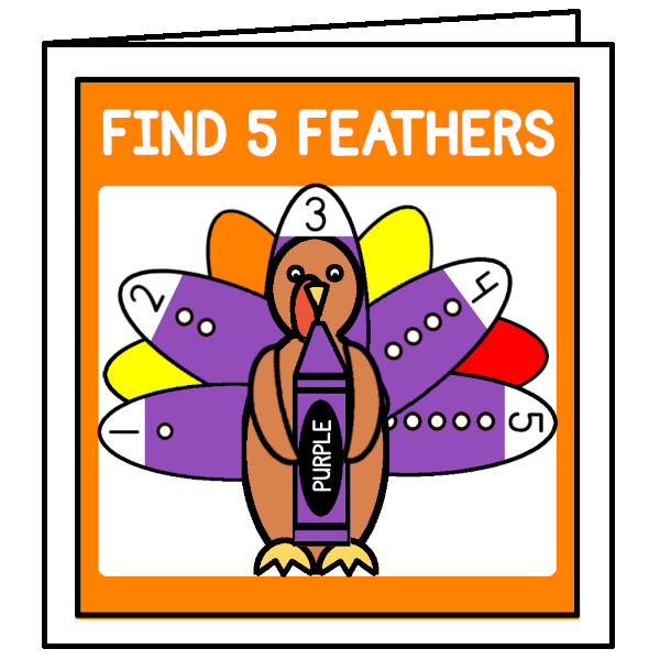 Four turkeys have lost their feathers.  Each turkey is holding a crayon with their feather color.  Be the first player to collect all 5 feathers.